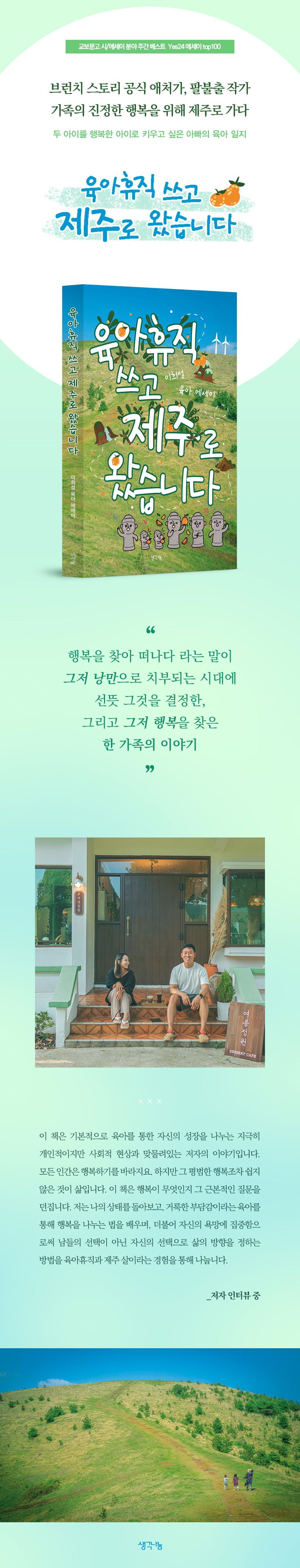 이 책은 기본적으로 육아를 통한 자신의 성장을 나누는 지극히 개인적이지만 사회적 현상과 맞물려있는 저자의 이야기입니다. 모든 인간은 행복하기를 바라지요. 하지만 그 평범한 행복조차 쉽지 않은 것이 삶입니다. 이 책은 행복이 무엇인지 그 근본적인 질문을 던집니다. 저는 나의 상태를 돌아보고, 거룩한 부담감이라는 육아를 통해 행복을 나누는 법을 배우며, 더불어 자신의 욕망에 집중함으로써 남들의 선택이 아닌 자신의 선택으로 삶의 방향을 정하는 방법을 육아휴직과 제주 살이라는 경험을 통해 나눕니다.