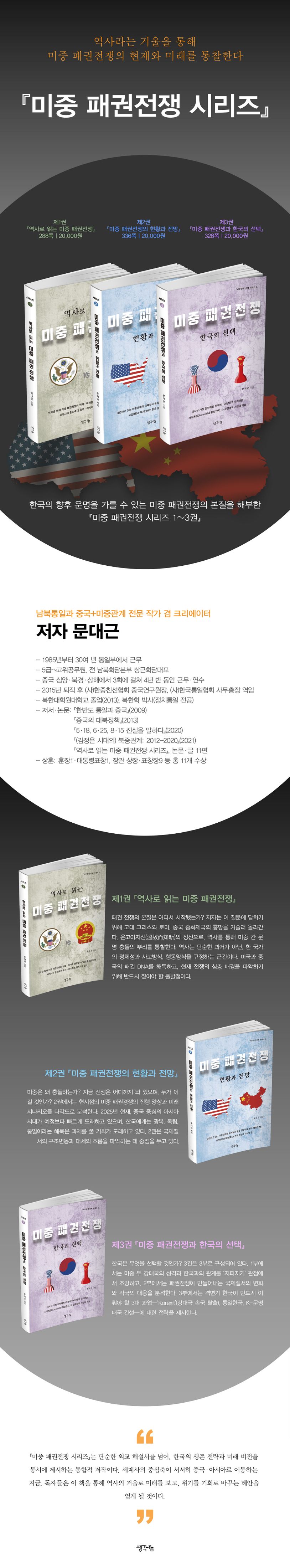 저자:문대근 남북통일과중국+미중관계전문작가겸크리에이터. 1985년부터30여년통일부에서근무(5급~고위공무원,전남북회담본부상근회담대표)했다.중국심양·북경·상해에서3회에걸쳐4년반동안근무·연수하며중국과북중·미중관계를공부했다.2015년퇴직후(사)한중친선협회중국연구원장,(사)한국통일협회사무총장등민간단체에서활동하다2018년이후남북통일과중국+미중관계글쓰기에열중이다. 최종학력:북한대학원대학교졸업(2013),북한학박사(정치통일전공) 저서·논문:『한반도통일과중국』(2009),『중국의대북정책』(2013),『5·18,6·25,8·15진실을말하다』(2020),『(김정은시대의)북중관계:2012-2020』(2021),『역사로읽는미중패권전쟁』,『미중패권전쟁의현황과전망』,『미중패권전쟁과한국의선택』(2025),논문·글11편 상훈:훈장1·대통령표창1,장관상장·표창장9등총11개수상(2009.9,최고기록공무원개인경쟁력분야최다포상자)