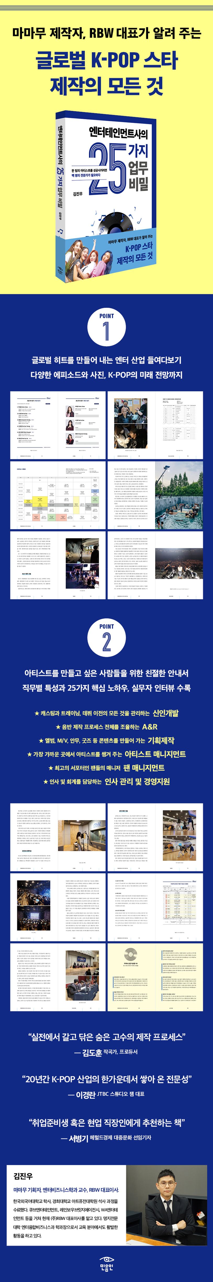 하지만 K-POP의 인기와 사회적 관심에 비하면 엔터 업계에 대한 정보는 여전히 일반인들에게 잘 알려져 있지 않다. 저자는 K-POP이 글로벌 시장에서 문화 콘텐츠로서 성공하는 데 바탕이 된 원동력을 ‘엔터사의 사람과 제작 시스템’에서 찾는다. 책에서는 아티스트가 탄생하여 대중과 만나게 되는 6가지 과정을 따라가면서 신인개발, A&R, 기획제작, 아티스트 매니지먼트, 팬 매니지먼트, 인사 관리 및 경영지원에서의 25가지 핵심 노하우를 선별했다. K-POP 스타를 만드는 과정에서 벌어지는 다양한 에피소드, 현장감 넘치는 사진, 직무별 특성과 실무자 인터뷰, 앞으로 펼쳐질 K-POP 3.0 시대에 대한 전망 등을 통해 누구나 흥미롭게 엔터 업계의 참모습을 들여다볼 수 있을 것이다.