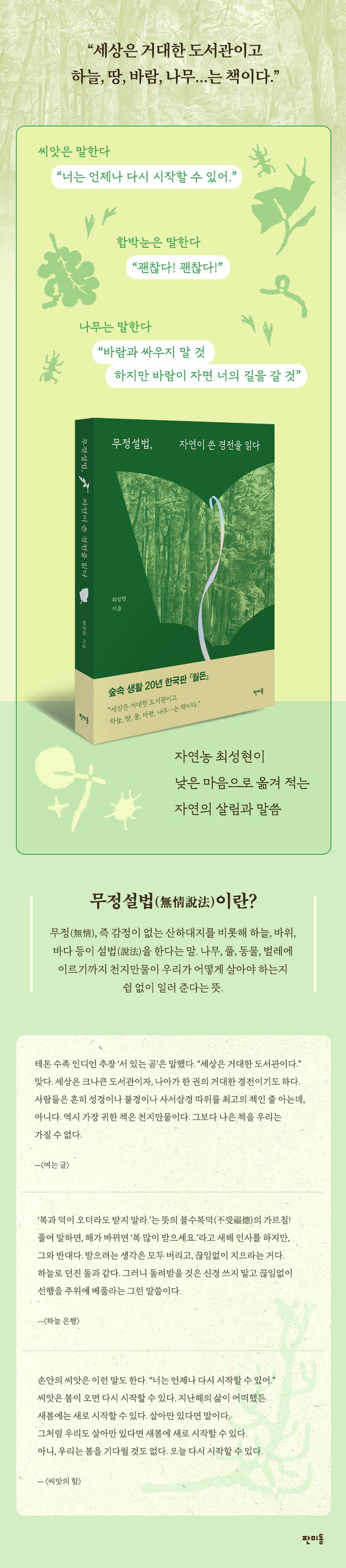 20년 넘게 숲속에서 살아온 농부 작가 최성현이 자연에서 배운 가르침들을 일상의 언어로 전하는 에세이 『무정설법, 자연이 쓴 경전을 읽다』가 판미동 출판사에서 출간되었다. 무정(無情)은 ‘마음을 가진 살아 있는 중생’인 불교 용어 ‘유정(有情)’에 반대되는 말로, 무정설법(無情說法)이란 곧 감정이 없는 산하대지를 비롯하여 하늘, 바위, 바다 등이 설법을 한다는 뜻이다. 나무, 풀, 동물, 벌레 등 천지만물이 우리가 어떻게 살아야 하는지를 쉼 없이 일러주고 있으니, 그 말씀을 ‘마음의 귀’를 열고 잘 듣고 새겨야 한다는 의미다.
