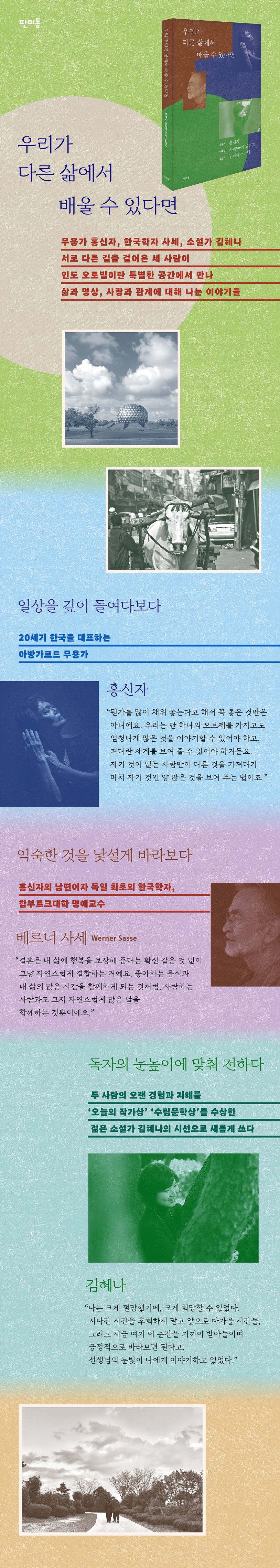 홍신자가일상의깊이를들여다본다면,독일출신의한국학자베르너사세는익숙한것을낯설게바라본다.한국문화를외부자의시선으로탐구하며,우리가당연하게여겨온연애및결혼문화,의식주등의생활방식속에서새로운통찰을발견한다.그의시선은한국과오로빌공동체에서경험한국경을초월한인간적연결로확장되는데,이는독자들에게익숙한일상을새롭게바라볼기회를제공한다.