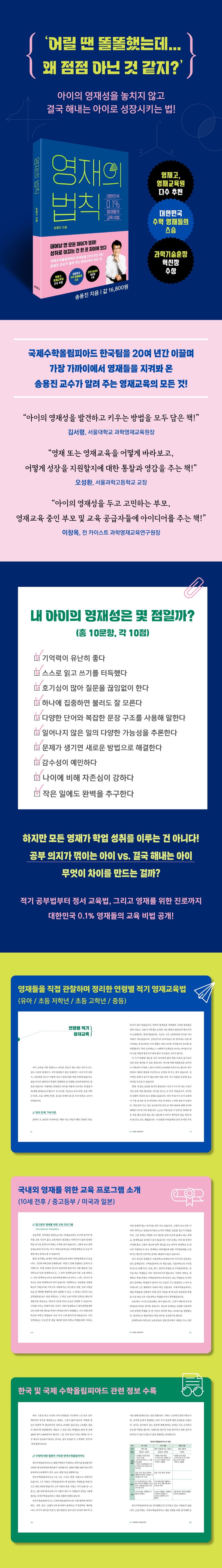 이 책에는 아이의 영재성을 놓치지 않고 끝까지 성취하는 아이로 키우기 위해 가정에서 할 수 있는 연령별 적기 영재 교육법은 물론, 영재교육원부터 영재고등학교까지 영재의 성장 과정에서 필요한 교육 기관에 관한 정보, 수학올림피아드 정보 등 실용적인 이야기도 담겼다. 또한 실제 경험과 다양한 사례를 통해 이후 영재가 사회에서 어떤 인재로 활약할 수 있을지도 그려 보고 있어서 아이의 영재성을 키워 주고 싶은 부모, 영재 아이를 둔 부모와 가르치는 선생님 모두에게 도움이 될 것이다.