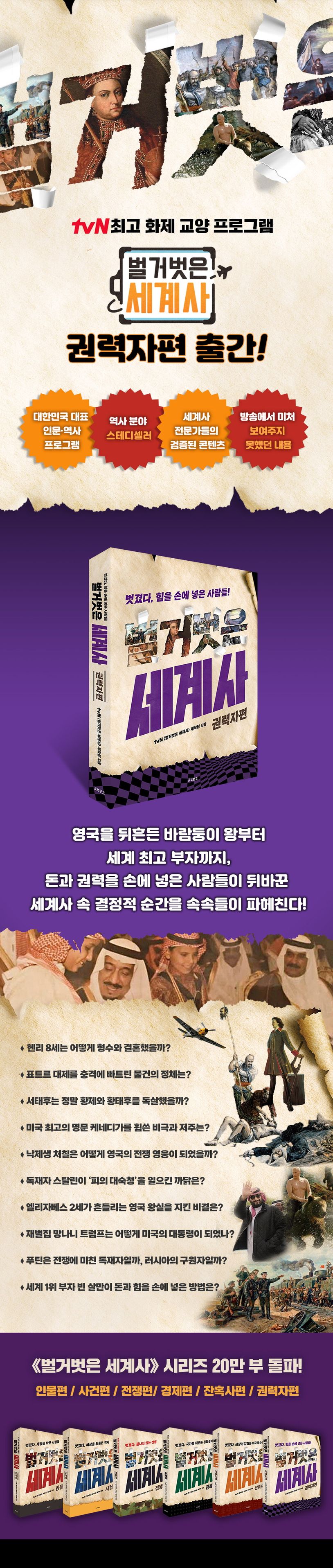 이 책은 tvN 최고 화제 교양 프로그램인 〈벌거벗은 세계사〉에서 다뤘던 내용 중 세상을 뒤흔든 권력자들의 이야기를 모아 만든 것입니다. 세계 역사에 큰 획을 그은 권력자가 탄생하는 순간은 물론, 그동안 자세히 알려지지 않았던 의외의 사실들까지 담았습니다. 타고난 바람둥이 기질로 무려 여섯 번이나 결혼한, 심지어 첫 결혼은 형의 아내와 했던 헨리 8세의 이야기부터 재벌집 망나니에서 미국 대통령까지 된 도널드 트럼프, 그리고 재산을 추정하기 어려울 정도로 돈이 많은 세계 1위 부자 빈 살만까지, 눈을 뗄 수 없는 돈과 힘의 역사가 입체적으로 펼쳐집니다. 특히 시간 관계상 방송에서 미처 보여주지 못했던 내용까지 상세하게 정리해 권력을 손에 넣은 사람들이 뒤바꾼 세계사 속 결정적 순간까지 확인할 수 있습니다.