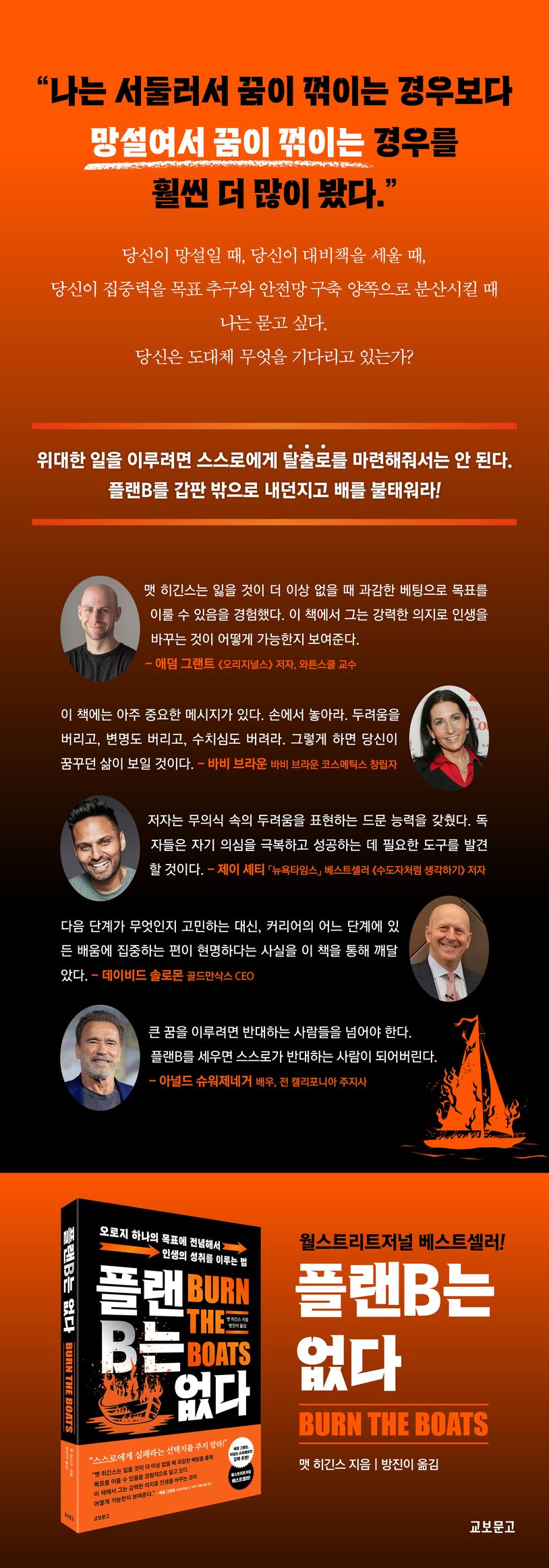 이것은 매우 단순한 법칙처럼 보이지만, 실천하는 데는 노하우가 필요하다. 《플랜B는 없다》 의 저자 맷 히긴스는 자신의 경험, 고대부터 이어져 온 선인들의 지혜, 그리고 현대의 과학적 연구 결과에서 발견한 노하우를 이 책에서 9단계로 나누어 설명한다.