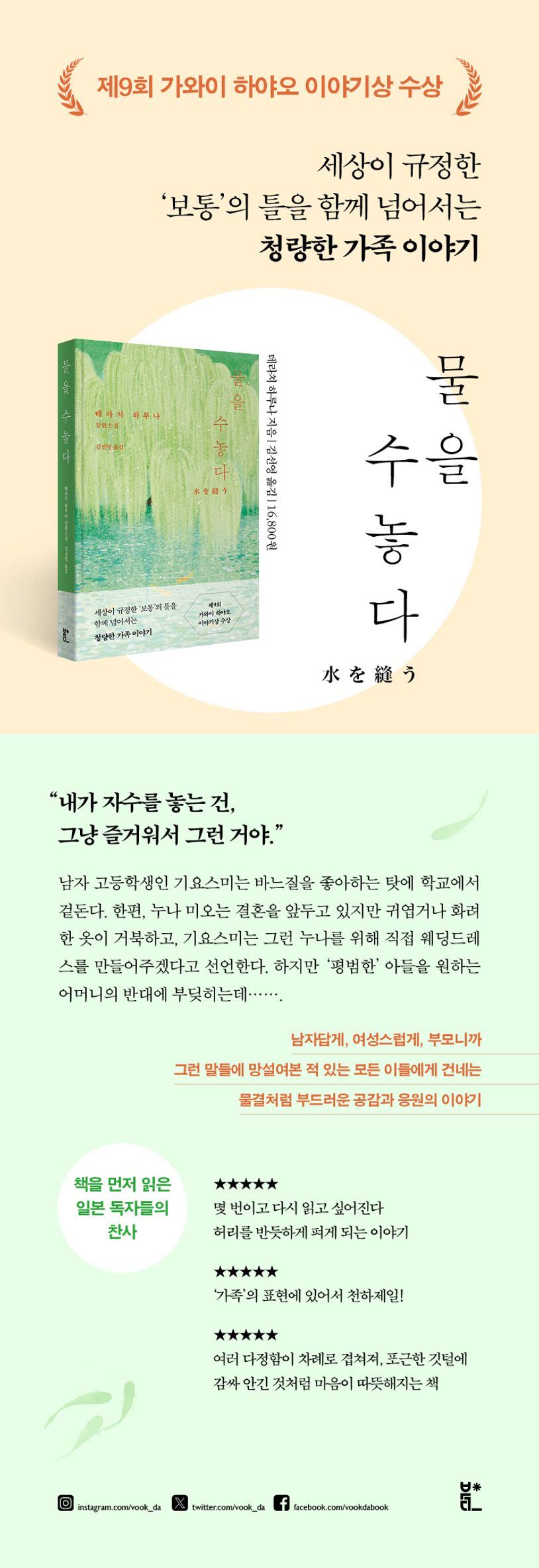 《물을 수놓다》는 바느질을 좋아하는 소년 ‘기요스미’가 귀여운 것을 싫어하는 누나 ‘미오’를 위해 웨딩드레스를 직접 만들어주려 도전하는 사건을 둘러싼 6인 가족의 이야기다. 남자 고등학생인 기요스미는 단지 바느질을 좋아하는 것만으로 ‘평범하지 않은’ 아이가 되어 주변의 걱정을 산다. 하지만 귀여운 것이 거북한 미오도, 다정한 애정 표현이 어려운 어머니 ‘사쓰코’도, 그밖에 다른 가족들도 저마다 세상이 요구하는 ‘보통’에 못 미치는 면을 지니고 있다. ‘보통 사람’, ‘보통 가족’이라는 것이 정말로 존재할까? 의심하면서도 우리는 ‘보통’이라는 틀 안에 속하기 위해 가끔 관심이 없는 일에도 있는 척을 하고, 좋아하는 것을 아닌 척하고는 한다. 그런 씁쓸함을 느낀 적 있는 독자라면 분명, ‘나답게 살아가는 떳떳함’에 대한 응원으로 가득한 이 소설을 통해 가슴 한편이 시원해지는 청량한 감동을 맛볼 수 있을 것이다.