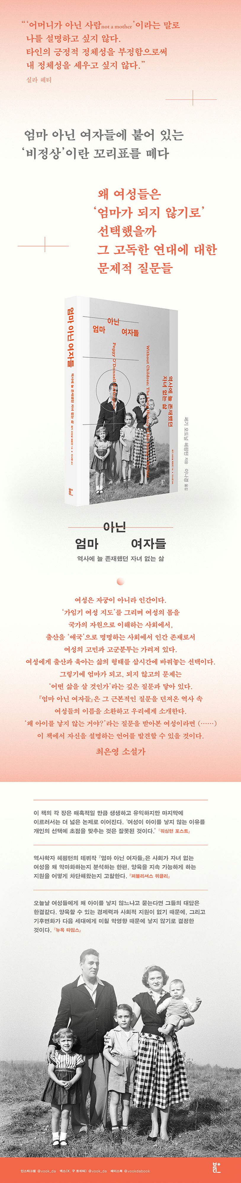우리는 자녀 가진 여성을 어머니라고 부른다. 반면 자녀 없는 여성을 비하하지 않고 일컫는 말은 ‘자녀 없는 여성’뿐이다. 그 사람이 가지지 못한 존재나 그 사람이 되지 못한 존재(즉, 어머니)를 들어서 부르는 방법밖에 없다. 이 책의 저자이자 시카고 대학교에서 역사학을 가르치고 있는 페기 오도널 헤핑턴은 “과거에도 늘 존재했으며 점차 익숙해지고 있는 자녀 없이 사는 삶에 적당한 용어가 없다는 사실”(「작가의 말」)에 주목하고, 이런 삶을 가리키는 언어를 우리가 만들고 정의해야만 자녀 유무와 상관없이 모든 여성의 연대를 이룰 수 있다고 말한다.