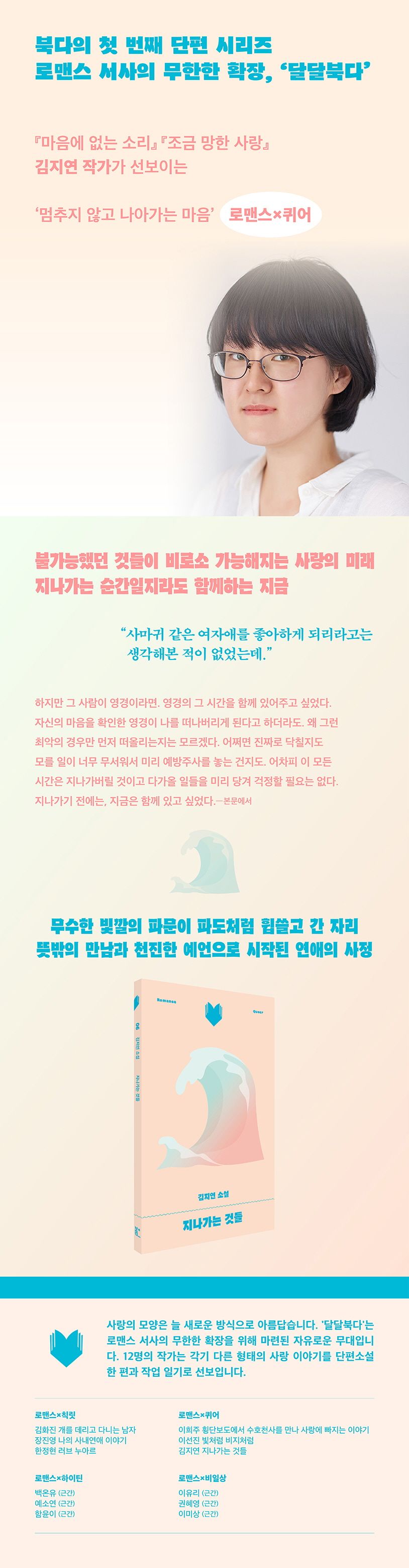 ‘달달북다’의 여섯 번째 작품은 김지연의 『지나가는 것들』이다. 2018년 심사위원 만장일치로 문학동네신인상을 수상하며 작품 활동을 시작한 김지연은 전작 『조금 망한 사랑』 『마음에 없는 소리』를 통해 다양한 자리에 있는 여성들의 삶을 조명하며 희미하고 미약하지만 아직 남아 있는 삶의 가능성에 대해 이야기해왔다. 이번 작품에서 김지연은 미래를 기대하거나 미래를 그려본 적 없던 이십대 초반의 여성을 주인공으로 불가능했던 것들을 가능하게 만드는 사랑의 미래에 대한 로맨스 소설을 선보인다.