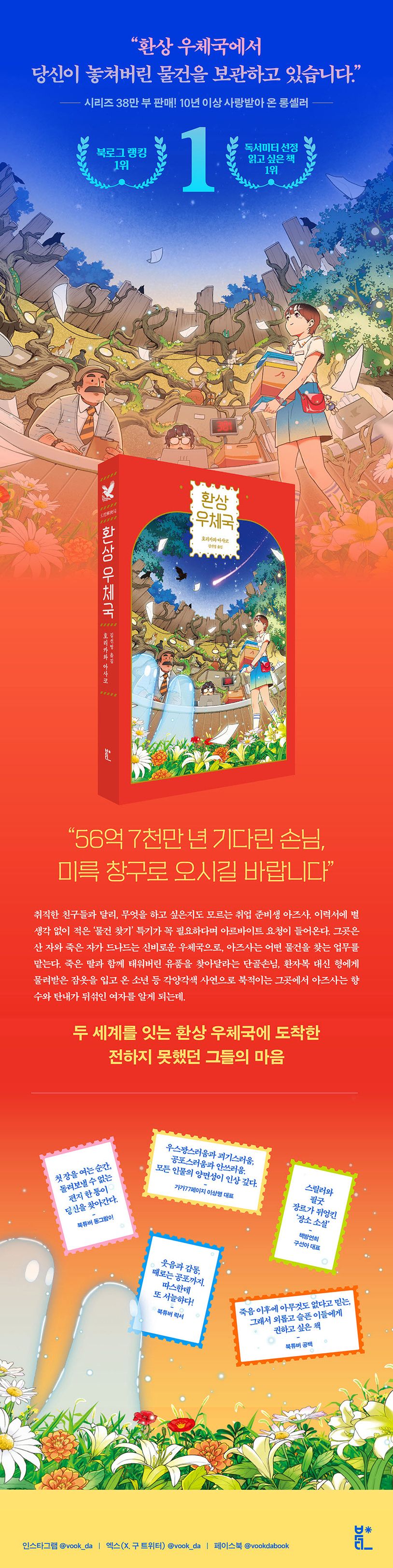 특기가‘물건찾기’인주인공과함께하는동안독자는환상우체국에맡겨진배달물품에담긴저마다의사연과마음에울고웃게된다.모든등장인물은우스꽝스러움과괴기스러움,안쓰러움과대견함,공포와용기등양면성을지니고있는데,이는죽음을대하는작가의태도와상통한다.어떤편지가오가고그안에어떤비밀이숨어있는지,우체국에서일어나는일이현실인지환상인지애써구분할필요도없다.분리되어있다고여겼던두관념의경계를지우는순간비로소공포는이해로,혐오는호감으로바뀌어상대를있는그대로받아들이게된다.