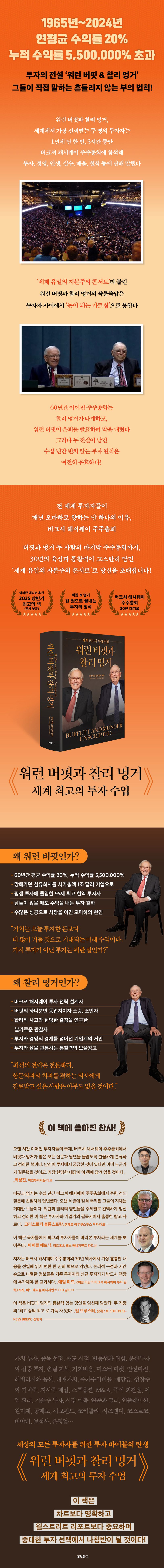 두사람이오랜시간압도적인수익률을달성하며투자계의전설로자리잡은비결은버크셔해서웨이주주총회현장발언속에서찾을수있다.《워런버핏과찰리멍거:세계최고의투자수업》은버핏과멍거의실전투자경험에서나온지혜를바탕으로30년이라는시간이흘러도변하지않는투자와경영의원칙이무엇인지알려준다.