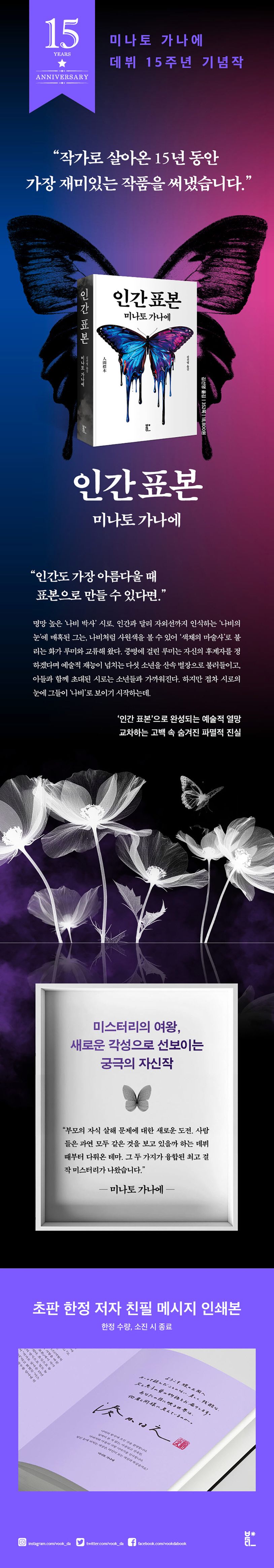 2008년 『고백』으로 혜성처럼 데뷔해 주간문춘 미스터리 베스트 1위에 랭킹, 제6회 서점대상을 수상하며 일본 문학계를 뒤흔든 작가 미나토 가나에. 그가 데뷔 15주년을 맞아 쓴 기념비적인 신작 『인간 표본』이 북다에서 출간되었다. 나비 학자 사카키 시로가 다섯 명의 미소년을 살해하고 시신을 가공해 다양한 나비에 빗댄 ‘인간 표본’을 만들었다고 고백하는 수기로 시작되는 『인간 표본』. ‘나비의 시선’이라는 독특한 모티브와 미(美)를 향한 광기가 맞물리는 이 섬뜩하고 탐미적인 미스터리 소설의 집필 계기에 대해 작가는 일본 인터뷰에서 다음과 같이 밝혔다.