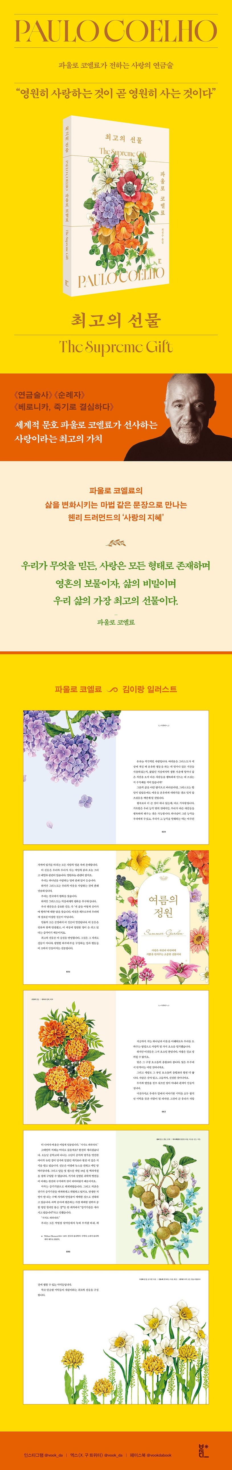 사랑의 가치와 의미를 점점 잃어가는 시대에 파울로 코엘료가 사랑의 무한한 가능성을 다시 한번 일깨운다. 전 세계 170개국에서 88개 언어로 번역되어 3억 2천만 독자의 마음을 사로잡은 우리 시대 가장 영향력 있는 작가 파울로 코엘료는 인생 최고의 선물은 ‘사랑’이라고 말한다. 『최고의 선물』은 세상에서 가장 아름다운 글 가운데 하나로 알려져 있는 종교 사상가 헨리 드러먼드의 저서 『세상에서 가장 위대한 것(The Greatest Thing in the World)』에서 작가가 영감을 받아 자유롭게 쓴 에세이로, 사랑에 관한 깊은 성찰과 깨달음이 빛나는 문장들로 함축되어 있다.