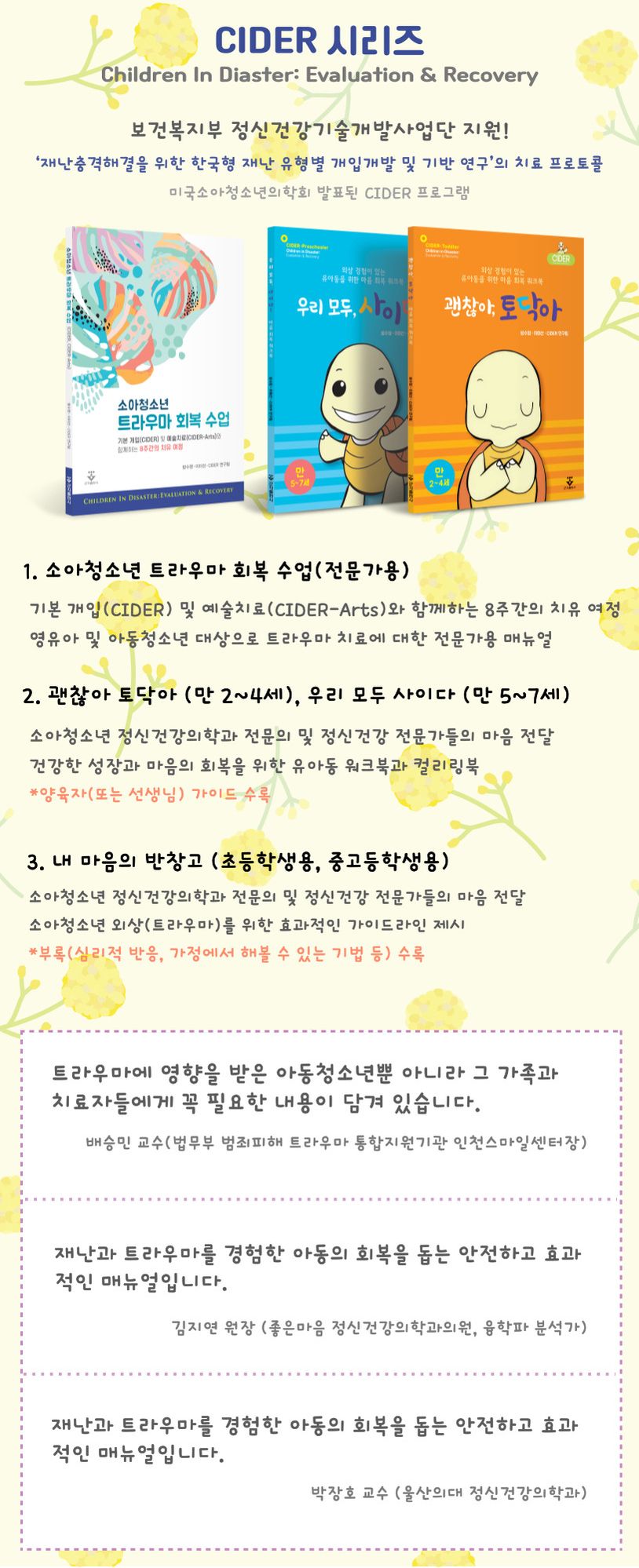 재난충격 해결을 위한 한국형 재난 유형별 개입기술 개발 및 기반 연구과제 내용의 일부를 소개하는 워크북이다. 소아 재난 기본 치료(Children In Disaster: Evaluation & Recovery, CIDER)에 준하였으며, 소아청소년의 발달단계를 고려하여 구성하였다. 소아청소년 정신건강의학과 전문의 및 정신건강 전문가들이 집필하였으며, 워크북, 컬러링 북, 양육자 가이드로 구성되어 있다.