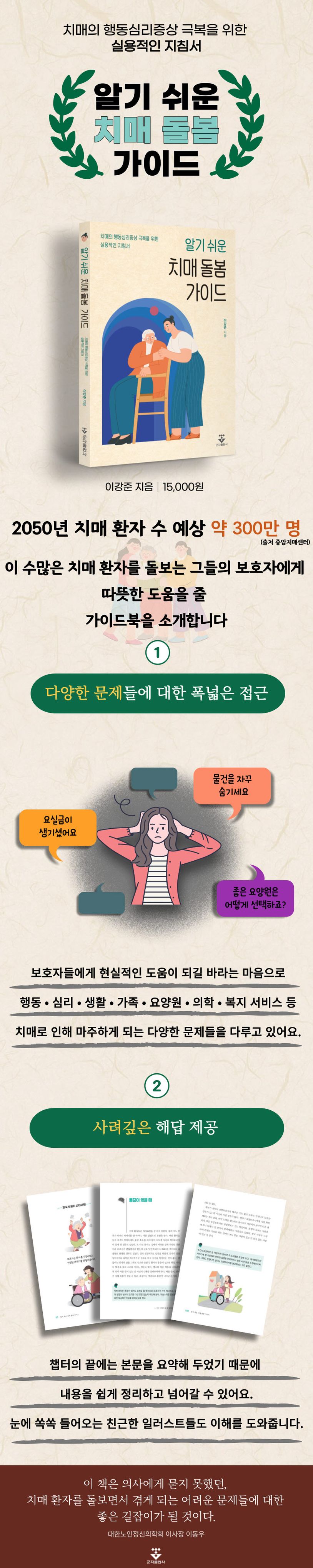 필자는 치매 환자를 돌보는 데 조금이라도 도움이 되기를 바라는 마음으로 이 책을 쓰게 되었다. 짧은 진료 시간에 환자와 보호자의 궁금한 사항들에 대해 일일이 답변드릴 수 없어서 다양한 이상행동과 심리증상에 대한 대처 방법을 정리해 보았다. 의사와 환자, 그리고 보호자가 경험을 공유하면서 더 나은 치료 방법을 찾을 수 있는 계기가 되기를 바란다.