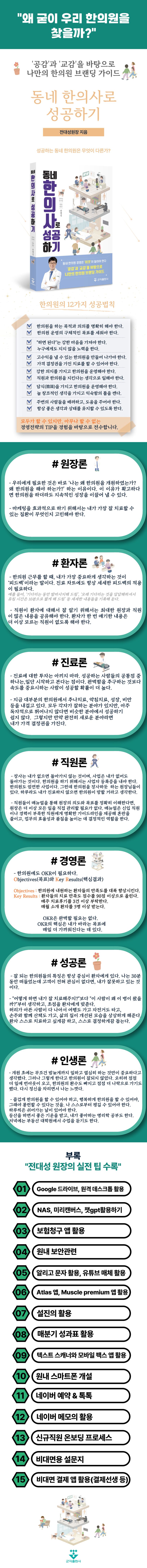 이 책을 통해 한의사들이 단순한 치료자가 아닌, 성공적인 경영자로서 한의원을 운영할 수 있는 방법을 제시하고자 한다. 이는 한의학의 가치를 현대사회에서 더욱 높이고, 더 많은 사람들에게 건강과 치유를 제공할 수 있는 중요한 열쇠가 될 것이다.