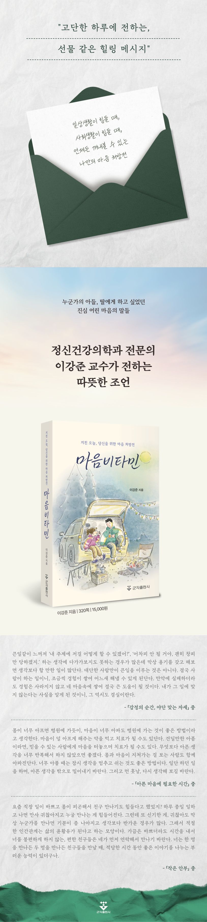 『마음비타민』은 정신건강의학과 전문의이자 한 가정의 아버지인 이강준 저자가, 젊은 세대와 자녀들에게 전하고 싶었던 진심 어린 조언을 엮은 에세이입니다. 삶의 여러 갈림길 앞에서 마음이 지치고 흔들릴 때, 저자는 짧지만 깊이 있는 문장들로 다정한 위로와 용기를 건넵니다.