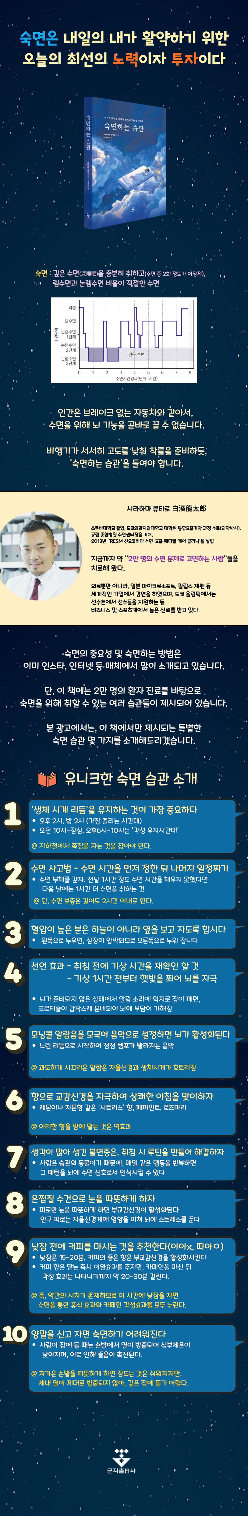 여기, 2만여 명의 수면장애 환자를 진료해 온 임상의가, 환자와 본인의 수면 습관을 돌이켜보며 얻은 소중한 지식들을 책 한 권에 담아 두었습니다. 저에게 숙면을 선물해 준 이 책이 많은 분들께 행복한 밤을 선사하길 기원합니다.
