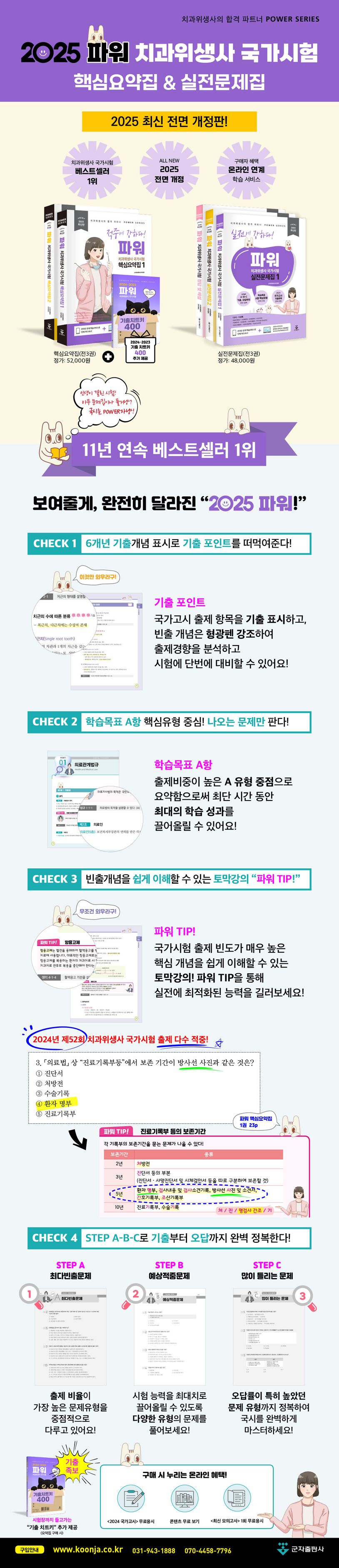 -치과위생사국가시험“11년연속”베스트셀러1위-ALLNEW!2025최신개정된파워치과위생사-구매자혜택으로온라인연계학습서비스제공치과위생사국가시험을위한최강합격파트너!〈2025파워치과위생사국가시험〉이최신개정을통해새롭게태어났습니다.2024기출트렌드까지모두반영한이번개정판은치과위생사국가시험에출제될수있는모든핵심개념들을철저히담아수험생들이다가올시험에빈틈없이대비할수있도록완벽하게개정되었습니다.11년간최다합격생을배출한“파워”만의노하우와최신출제경향을접목한2025개정판은수험생들이최단시간에최대의학습효과를이끌어낼수있도록도와줍니다.“핵심요약집”은기출문제를철저하게분석하여과목별중요빈출개념을명확히표기하였으며,다양한삽화와파워TIP!강의코너를통해실전능력을한층더향상시킬수있도록구성되었습니다.추가로국가시험에기출된핵심내용을한데모아정리한시험족보인“기출치트키”를함께제공하여시험을치르는그날까지수험생들에게든든한파트너가되어드립니다.“실전문제집”에는파워만의문항분석시스템으로치과위생사국가시험에출제될수있는모든유형의문제를분석하고선별한총3,300제의문제가수록되어있습니다.각각의과목마다빈출유형과핵심예상문제,자주틀리는문제등을철저히분석하여“STEPA-B-C”로구성함으로써학습자는다가올국가시험에완벽하게대비할수있습니다.또한온라인연계학습서비스인스마트에듀K(www.smarteduk.com)를통해언제어디서나,치과위생사국가시험대비학습을온라인으로이어갈수있습니다.학습내용을데이터화하고문제풀이와오답에대한실시간피드백을받아과목별취약점을확인하고합격가능성을더욱더높일수있는기회를제공합니다.지금바로〈2025파워치과위생사국가시험〉을구매하여치과위생사국가시험합격의꿈을이루어보세요!