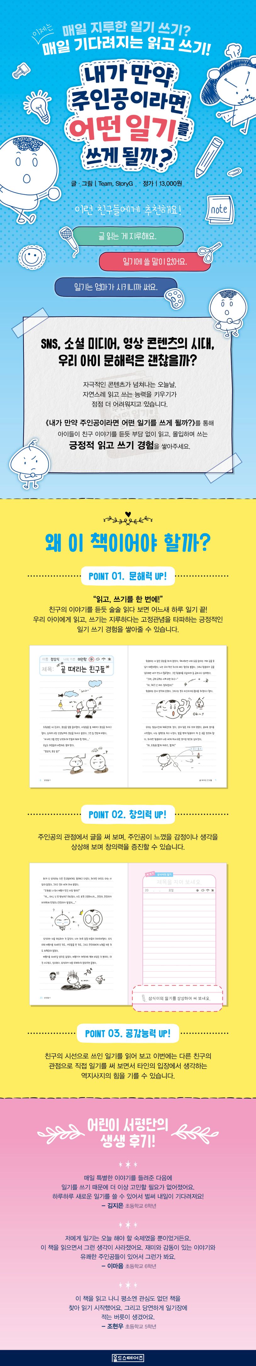 《내가 만약 주인공이라면 어떤 일기를 쓰게 될까?》에서는 매일 다른 에피소드를 통해 생각해 볼거리와 쓸거리를 제공하여, 아이들이 스스로 사고하고, 상상해 보며, 창의적인 글쓰기까지 도달하는 방법을 제시해 주고 있습니다.