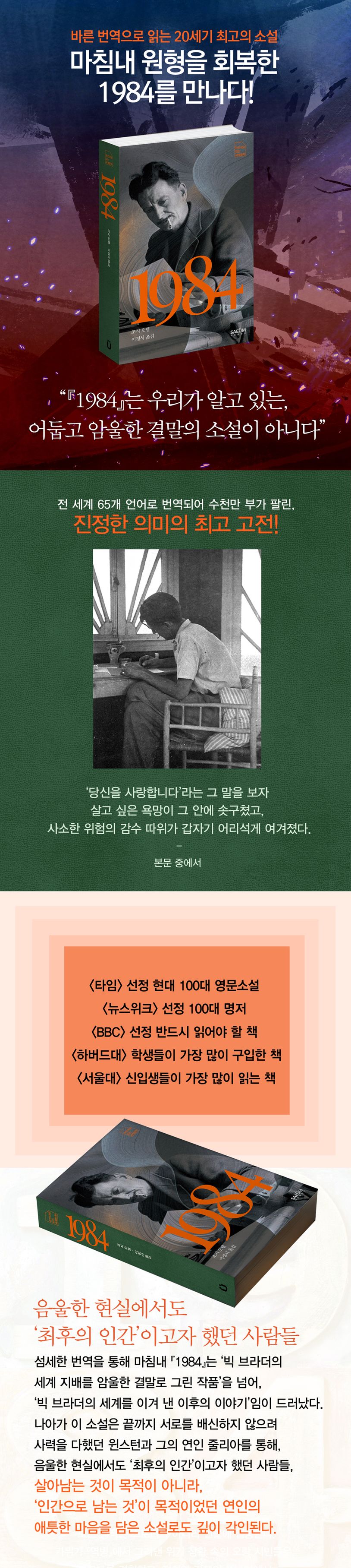 역자 이정서는 ‘친절한 번역’이라는 말 아래 일어나는 기존 번역들의 자의적이고 임의적인 의역에 대한 문제의식을 주창해 왔다. 그의 새로운 번역서인 이번 『1984』 역시 작가의 문체를 고스란히 담아낸 ‘직역’을 통해 본래 『1984』의 실체를 여실히 보여주고 있다. 섬세한 번역 위에서 마침내 『1984』는 ‘빅 브라더의 세계 지배를 암울한 결말로 그린 작품’을 넘어, ‘빅 브라더의 세계를 이겨 낸 이후의 이야기’임이 드러나게 된 셈이다.