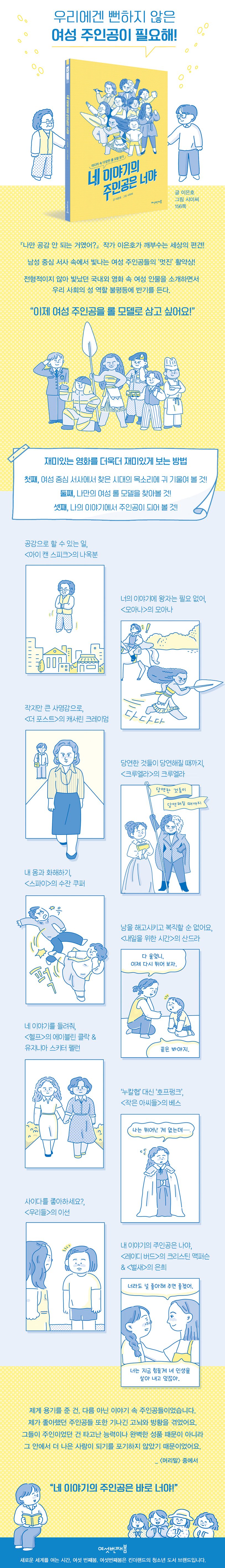 작가는 기사와 첫 책 『나만 공감 안 되는 거였어?』에서 여성을 부적절하게 소비하는 세태를 꾸준히 꼬집어 왔다. 그리고 이번에는 긍정적이고 의미 있게 그려진 영화 속 여성 주인공들에 대해 이야기한다. 연예부 기자 출신으로서의 경험과 고민을 이 책에 잘 녹여냄으로써 여성 중심 서사야말로 세상의 성 불평등을 바로잡을 수 있는 대안 중 하나라고 말한다. 더 이상 극 중 여성 인물이 로맨스의 대상, 일부 조력자, 범죄의 피해자에 머물지 않고 당당하고 진취적인 서사의 주인공으로 남길 바라면서.