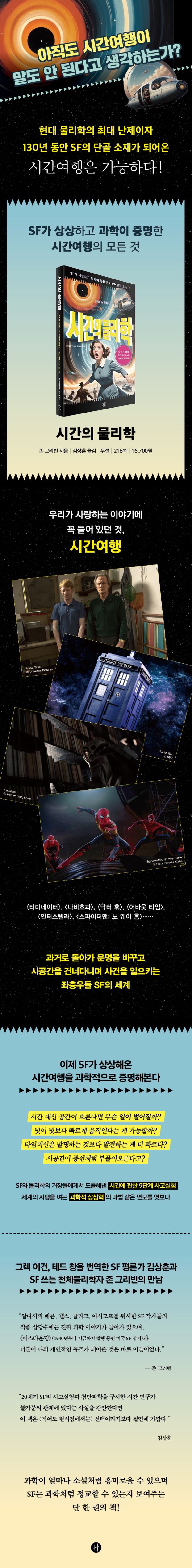 저자는 허버트 조지 웰스, 아서 C. 클라크, 아이작 아시모프 등 자신이 사랑해온 SF 작가들의 소설 속 시간여행의 가능성을 차근차근 살펴본다. 그는 시간여행이라는 아이디어에 담긴 과학적 실체를 낱낱이 탐색하고 이를 알베르트 아인슈타인, 칼 세이건, 미치오 카쿠 등이 탐구해온 상대성이론, 블랙홀, 멀티버스 등에 대한 연구와 비교한다. 저자는 다양한 콘텐츠를 통해 시간여행이라는 소재에는 익숙해졌지만 그것이 현실과는 거리가 먼 소설적 상상에 불과하다고 생각해온 많은 사람들에게 말한다. 시간여행은 진지한 과학의 대상이며, SF는 재밌는 이야기일 뿐만 아니라 그 자체로 물리학적 사고실험이라고. 독자들은 《시간의 물리학》을 읽으며 시간여행의 가능성을 탐색하는 것은 물론, 시간에 대한 고정관념에서 벗어나 SF와 과학이 하나 되는 순간의 지적 즐거움을 만끽할 수 있을 것이다.