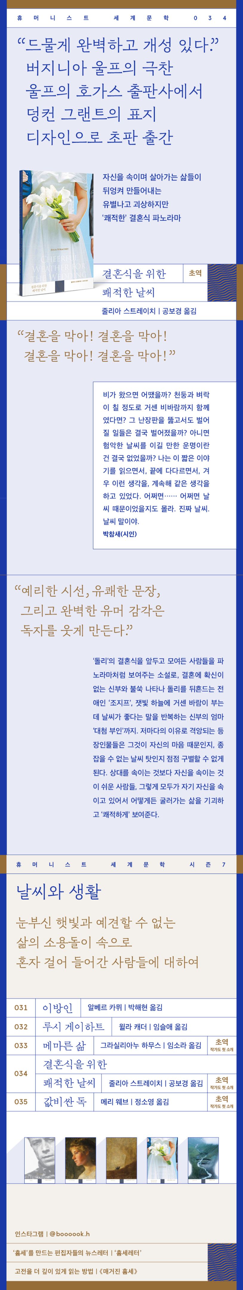버지니아 울프가 “드물게 완벽하고 개성이 있다”라고 극찬했던 줄리아 스트레이치의 대표작. 작가도 작품도 국내 첫 소개. 울프의 호가스 출판사에서 덩컨 그랜트의 표지 디자인으로 출간되었다. ‘돌리’의 결혼식을 앞두고 모여든 사람들을 파노라마처럼 보여주는 소설로, 결혼에 확신이 없는 신부와 불쑥 나타나 돌리를 뒤흔드는 전 애인 ‘조지프’, 잿빛 하늘에 거센 바람이 불어드는데 자꾸 날씨가 좋다는 말을 반복하는 신부의 엄마 ‘대첨 부인’까지. 저마다의 이유로 격앙되는 등장인물들은 그것이 자신의 마음 때문인지, 종잡을 수 없는 날씨 탓인지 점점 구별할 수 없게 된다. 상대를 속이는 것보다 자신을 속이는 것이 쉬운 사람들, 그렇게 모두가 자기 자신을 속이고 있어서 어떻게든 굴러가는 삶을 기괴하고 ‘쾌적하게’ 보여준다. 2012년 영국에서 펄리시티 존스가 돌리 역을 맡은 동명의 영화로도 제작되었다.