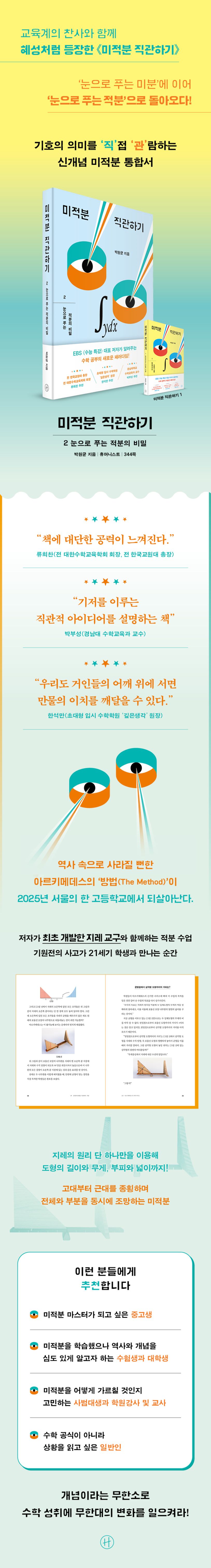 2028학년도 수능 개편 2년 전, 현재 고등학교 1학년부터 수능에서 미적분Ⅱ가 평가 영역에서 제외되며 수학 학습의 격변이 예고되었다. 미적분이 AI 기술의 기초가 되는 미래 사회를 앞두고, 정작 입시 현장에서는 수학적 기초 체력이 약화될 수 있는 역설적인 상황이 펼쳐진 것이다. 그 와중에 일부 대학은 자연 계열 지원 시 미적분Ⅱ를 권장과목으로 안내하는 등 가중되는 혼란과 함께 전략적 수학 공부의 필요성이 급부상하고 있다. 이러한 전환기의 요구에 맞춰, 교육계의 찬사와 함께 혜성처럼 등장한 《미적분 직관하기》가 ‘눈으로 푸는 미분’에 이어 ‘눈으로 푸는 적분’으로 돌아왔다.