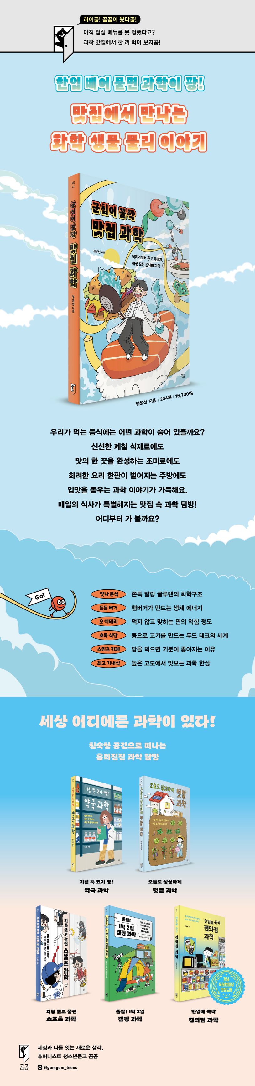 오늘의 식사 메뉴가 고민된다면, 혹은 더 특별한 미식을 즐기고 싶다면 《군침이 꼴깍 맛집 과학》을 펼쳐 보자. 알고 먹으면 더 맛있는 법! 식사 전이라면 맛깔나는 화학, 생물, 물리 이야기가 입맛을 돌게 하고, 식사 후라면 달콤한 디저트가 되어 줄 것이다.