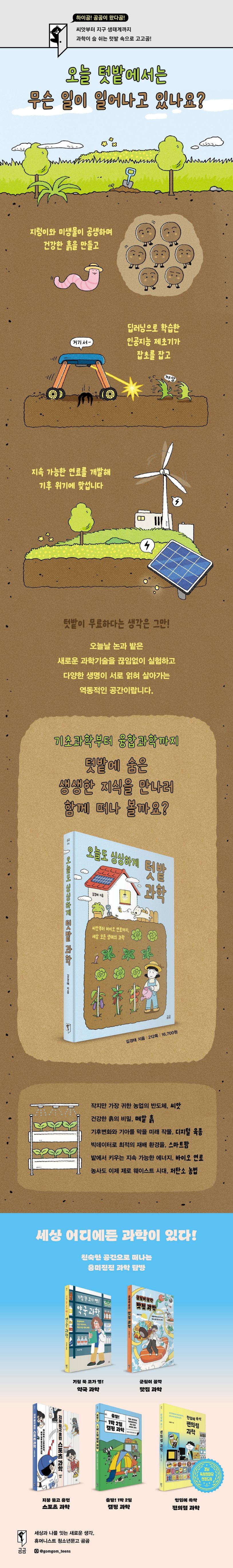 《오늘도 싱싱하게 텃밭 과학》은 텃밭이라는 공간을 통해 생물, 화학, 지구과학을 친근하게 만나는 과학 교양서다. 흙 속 미생물의 역할, 비료와 살충제의 작용 원리 등 기초적인 과학 지식부터 AI 기술이 접목된 농기계, 빅데이터를 기반으로 한 스마트팜, 유전자 편집 기술을 활용한 육종 등 농업을 둘러싼 최신 과학 기술까지 폭넓게 다룬다. 아울러 저탄소 농업, 제로 웨이스트 농법, 바이오 연료와 같이 기후 위기에 대응하는 새로운 농업 기술과 미래 과학도 소개한다.