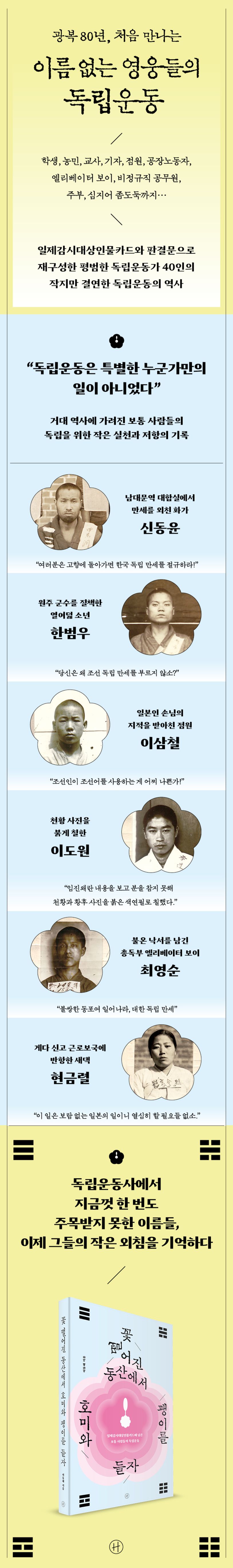 3등대합실에서만세를외친화가신동윤부터만세시위를막으려는원주군수를질책한열여덟소년한범우,식민지교육에동맹휴학으로저항한학생정동화,3·1운동기념격문을붙인인쇄공송병천,잡지읽고각성한농민안천수,총독부앞만세시위를계획한종교인함용환,불온낙서를남긴엘리베이터보이최영순,도둑에서독립운동가로변신한이제국,게다신고근로보국에나선새댁현금렬,축구부로위장한학생비밀결사를만든김철용,조선말을쓴다는이유로체포된점원이삼철….독립운동사에서지금껏한번도주목받지못한이름들이다.