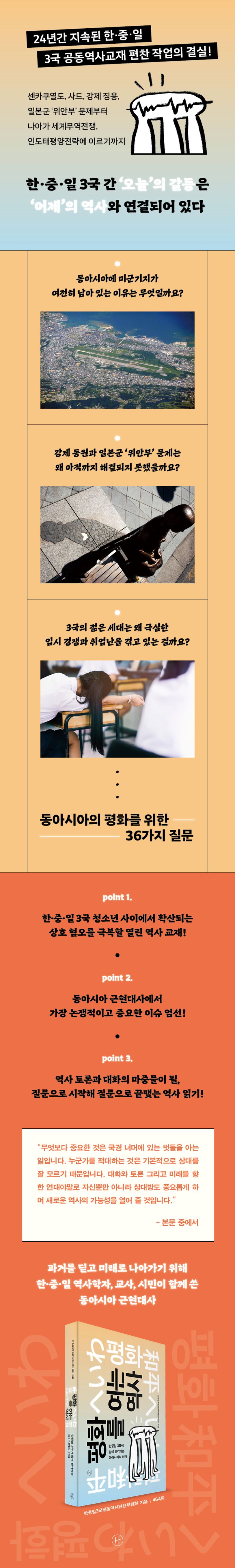 저자:한중일3국공동역사편찬위원회 2002년3월중국난징에서열린제1회‘역사인식과동아시아평화포럼’에모인한·중·일3국참가자들이동아시아공동의역사인식을공유하기위해공동역사교재를출간하기로결정하면서활동을시작했다.한국에서는아시아평화와역사교육연대산하한중일공동역사교재위원회소속의학자와교사가,중국에서는중국사회과학원근대사연구소를비롯해여러학자가,일본에서는학자및시민단체,교사들이위원으로참가하고있다.2002년부터4년의작업끝에2005년《미래를여는역사》가세나라에서동시출판되었다.이책은한·중·일3국이처음으로함께만든공동역사교재로동아시아에큰반향을일으켰으며,영어·에스페란토어로도번역되었다.2006년11월일본교토에서새로운공동역사서발간에합의하고,그후수많은회의와이메일논의를거쳐2012년《한중일이함께쓴동아시아근현대사》(1·2)를출판했다.이후로도한·중·일3국의역사인식의차이를좁히고확인하는지속적인노력과함께역사대화를통한교류와협력을지속적으로전개해나갈것이다. 아시아평화와역사교육연대|한·중·일교과서의역사왜곡을바로잡고,20세기침략과저항의역사에대한동아시아공동의역사인식을만들기위해2001년4월시민·사회단체,학자,교사등이모여결성했다.한·중·일을비롯한동아시아여러국가간역사갈등해결과평화로운역사인식을공유하기위해각종대중·연구·출판활동을진행하고있다.국내외여러시민·사회·연구단체와함께과거사청산활동에도적극참여하고있다.역사인식의문제는자라나는세대의미래에관한문제라는생각에중·일과공동역사책편찬,‘청소년역사체험캠프’,‘역사인식과동아시아평화포럼’등대안을제시하는활동을지속적으로전개하고있다. 홈페이지aphen.net