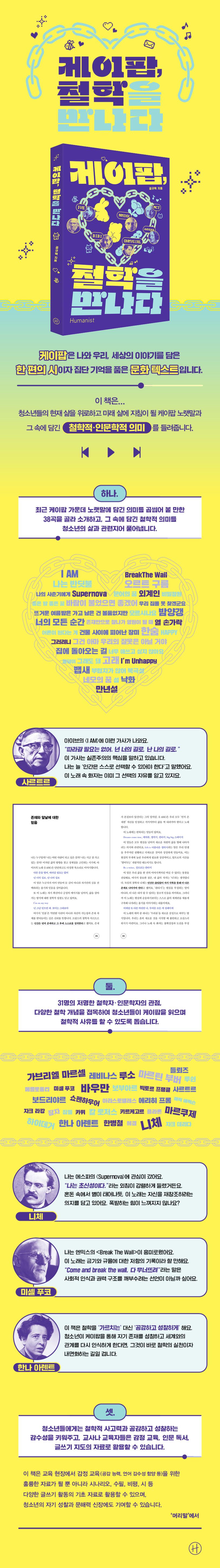 이 책은 아이브, 에스파, 아이유, 악동뮤지션, 장기하 등 유명 케이팝 가수들이 부른 노래를 단순한 감상의 대상이 아니라, 존재와 인식의 철학적 텍스트로 읽는다. 사르트르, 미셸 푸코, 니체, 한나 아렌트, 라캉, 들뢰즈, 아리스토텔레스 같은 철학자들의 생각을 케이팝의 주제와 자연스럽게 연결하여, 청소년들에게 친숙한 언어로 철학을 체험할 수 있도록 이끈다.