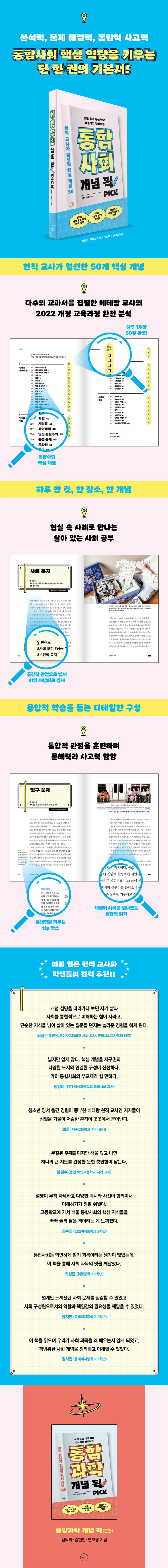 《통합사회 개념 픽》은 이러한 교과의 본질적 목표에 걸맞게 기획됐다. 첫째, 2007년 교육과정부터 2022년 개정 교육과정까지 꾸준히 교과서 집필에 참여해 온 베테랑 현직 교사들이 통합사회 교과서를 꼼꼼히 분석하고 50개의 주요 개념어를 엄선해 소개한다. 사회를 이해하고 분석하는 기초적 틀을 다지는 것은 물론 ‘스스로 생각하는 힘’을 기를 수 있도록 했다.