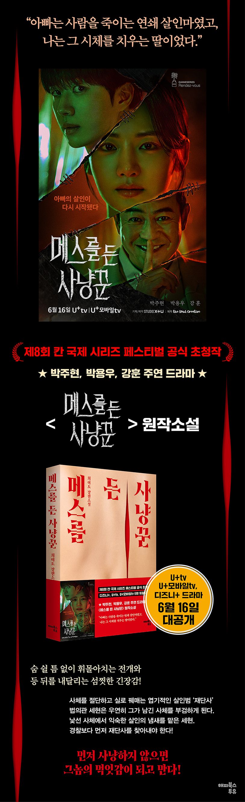 《메스를 든 사냥꾼》은 소시오패스 법의관 세현이 연쇄 살인범이 남긴 사체로 그를 뒤쫓는 이야기를 담은 미스터리 추격 스릴러 소설이다. 사체를 통해 살인범을 밝혀내는 독특한 소재와 더불어 법의관과 경찰, 각기 다른 인물의 시선으로 이야기를 전개해 신선함을 더했다.