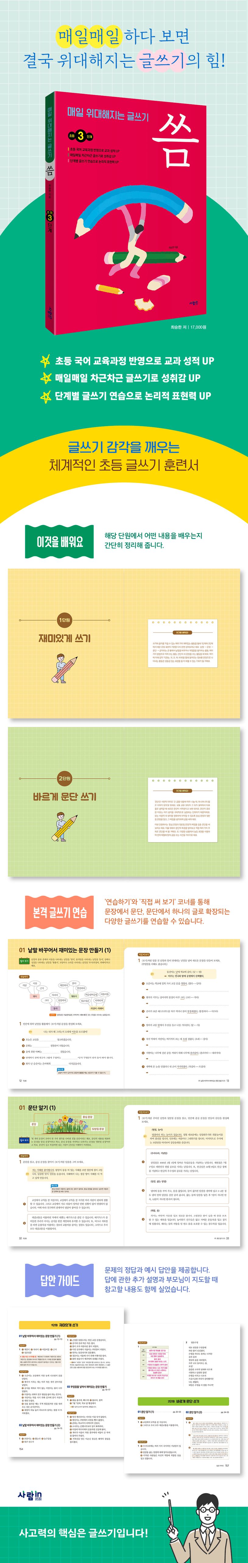 쓰기는 시간과 노력이 필요한 영역이라서 어느 정도 실력이 쌓이려면 오랜 시간 연습이 필요합니다. 『매일 위대해지는 글쓰기 씀』 시리즈는 단계별 초등 글쓰기 교재로, 초등 국어 교육과정을 충실히 반영해 학습자들이 매일 조금씩 꾸준히 글쓰기를 연습할 수 있습니다. 국어뿐 아니라 타 교과 내용도 적용해 다방면으로 글쓰기가 가능합니다. 학년별 교육과정을 기반으로 단계를 나누었지만, 학습자 본인의 쓰기 실력에 맞춰 어느 단계를 선택해도 괜찮습니다.
