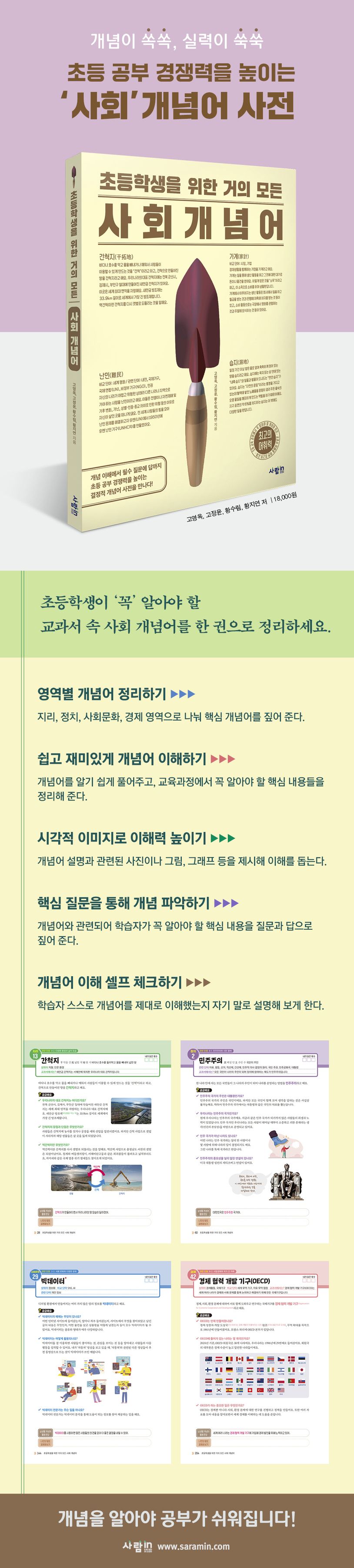 사회를 공부해야 하는 이유는 공동체를 이루며 살아온 사람들의 이야기가 담긴 세상을 이해하기 위해서입니다. 따라서 초등 사회 교과서에 나오는 개념들을 제대로 아는 것이 중요하죠. 그런데 교과서에 등장하는 개념어들은 한자어이거나 어려운 단어가 들어간 설명으로 인해 바로 이해하기 어려울 때가 많습니다. 이러다 보면 학생들은 공부의 방향성을 잃게 되고, 수업 시간은 점점 괴로워지죠. 이 책은 초등학생이 꼭 알아야 할 교과서 속 사회 개념들을 영역별로 나눠 사전식으로 이해하기 쉽게 풀어 설명했습니다. 또한 개념어와 관련된 여러 궁금증을 핵심 질문과 답을 통해 완벽히 정리해 줍니다.