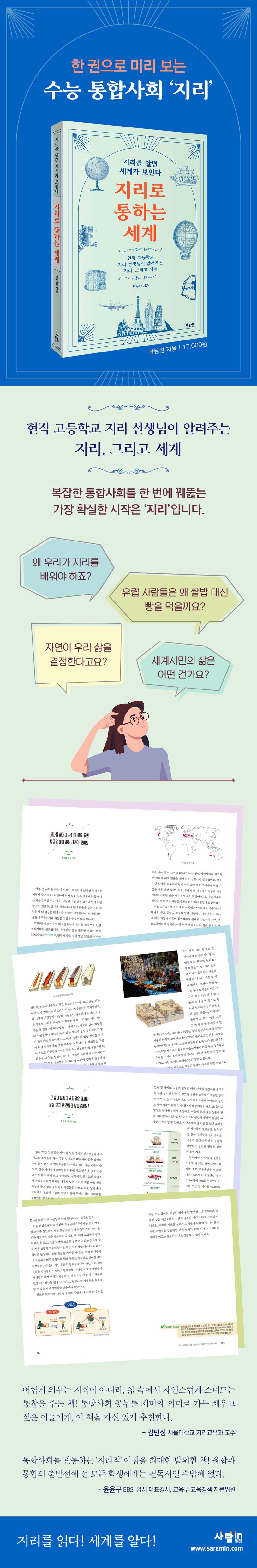 이 책에서는 〈통합사회〉의 ‘지리’ 영역에 관련된 내용을 보다 쉽고 재미있게 설명합니다. ‘지리’는 땅 위의 모든 일을 연구하고 배우는 학문으로, 단순히 자연환경만을 공부하는 과목이 아닙니다. 자연이 인간에게 미치는 영향뿐만 아니라 세계시민으로서 우리의 삶에 관해서도 알려주는 학문입니다. 이런 중요성 때문에 고등 교육과정에서도 중요 과목으로 자리 잡았고, 대학수학능력시험에서도 〈통합사회〉의 핵심 영역이 될 예정입니다. 시험을 위한 준비에 앞서 이 책은 지리에 관한 관심을 두고 지식과 교양을 키울 기회를 제공합니다.