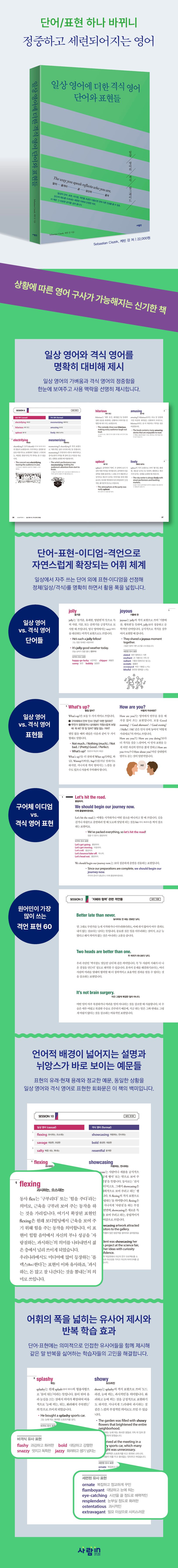 “우와, 쩌네요!”에서 ‘쩌네요’를 ‘훌륭하네요’로 바꾸는 순간, 누구에게나 써도 무리가 없는 격식 표현이 된다. 영어도 마찬가지다. 〈일상 영어에 더한 격식 영어 단어와 표현들〉은 이미 알고 있는 일상 영어가 어떤 격식 단어·표현과 대응하는지를 명확히 대비해 보여 주어, 문장의 톤을 단번에 달라지게 한다. 단순히 어려운 단어를 기계적으로 끼워 넣는 방식이 아니라, 말하는 목적·상황·상대에 따라 적절한 격식을 선택하는 능력, 즉 ‘영어의 품격’을 다룬다. 일상적으로 쓰는 표현을 출발점으로 삼아, 그로부터 한 단계 또는 두 단계 높인 격식 표현까지 자연스럽게 연결한다.