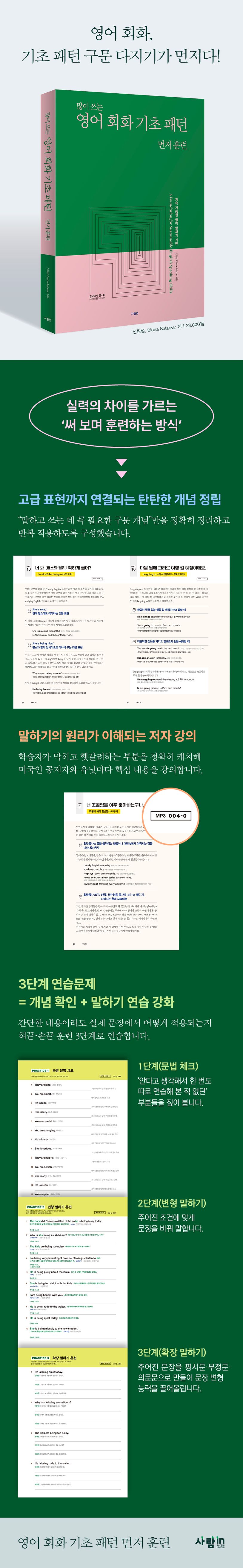 영어 말문을 트는 데 가장 좋은 방법 중 하나는 패턴 훈련이다. 하지만 패턴만으로 말하다 보면 어느 순간 표현이 막히거나 응용이 어려워지는 구간이 온다. 이 한계를 겪지 않으려면, 결국 영어 구문 기초가 탄탄해야 한다. 영어에 자신 없던 학습자에서 유창한 영어 구사자가 된 저자는, 이런 정체 구간을 벗어나기 위해 무엇을 공략해야 하는지 알고 있으며, 그 핵심을 〈영어 회화 기초 패턴 먼저 훈련〉에 담았다. 이 책은 3단계 훈련을 통해 ‘알고는 있지만, 말로는 못 하던’ 구문 기초를 근육 훈련처럼 익히게 한다. 눈으로만 보며 지나치던 내용을 손으로 써 보고 입으로 말해 보는 연습을 통해 패턴 학습의 전초기지를 확실히 다진다.