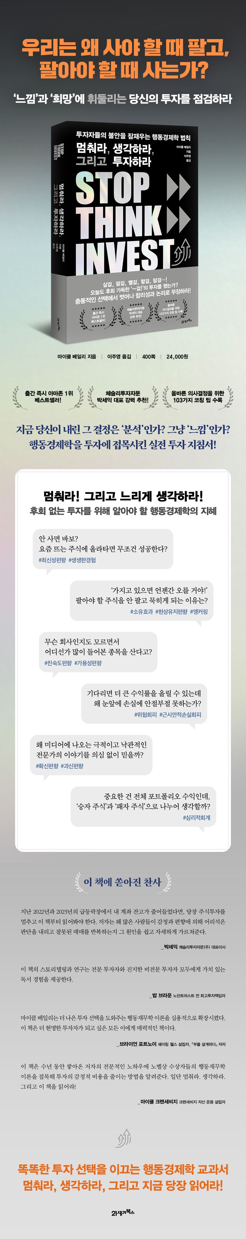 저자는 투자 결정에 관한 다양한 행동경제학 이론을 비롯해 자신이 투자했던 생생한 실제 사례, 그리고 편향을 줄이는 100가지 넘는 행동 코칭 팁을 제시한다. 이 책을 통해 독자들은 주식 거래의 각 단계마다 겪을 수 있는 심리적 함정과 편향에서 벗어나 투자의 기본 원칙을 지켜나갈 수 있다. 투자는 언제나 어려운 일이고 완벽한 의사결정은 거의 불가능하지만 우리가 반복해서 저지르는 ‘체계적인 오류’를 멈추는 방법은 존재한다. 멈춰라. 그리고 느리게 생각하라! 이 책이 후회 가득한 투자 결정에서 벗어나 성공에 한 발짝 더 가까이 다가갈 수 있도록 도와줄 것이다.