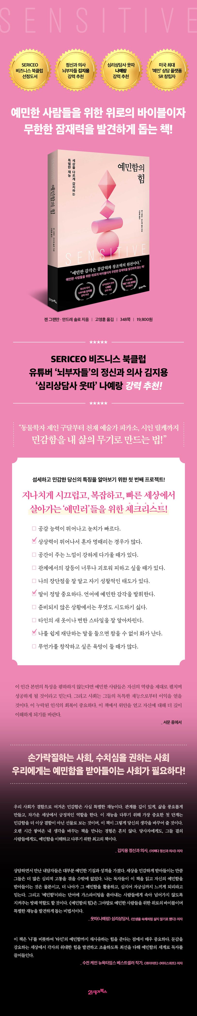 이러한 예민함에 대한 오해를 풀며, 자신의 민감한 기질 때문에 힘들어하는 사람들의 마음을 위로하고, 예민함을 장점으로 바라봄으로써 이를 특별한 재능으로 발휘하게 돕는 책이 출간됐다. 저자인 젠 그랜만과 안드레 솔로는 미국 최대 상담 플랫폼 SR(Sensitivie Refuge)의 공동 창립자이자 편집장, 저널리스트이며 누구보다 뛰어난 ‘예민함Sensitive’ 스페셜리스트다. 예민함에 대한 숱한 세상의 편견을 체계적인 이론으로 바로잡고, 실제로 자신의 민감함이 어느 정도인지 가늠할 수 있는 체크리스트를 제공하며, 관계와 업무, 일상까지 예민함을 활용하여 뛰어난 성과를 가져오는 비법을 알려준다. 더 이상 당신의 예민함을 숨기려 애쓰지 마라. 이 책을 읽고 나면 당신이 고민하던 ‘예민한 기질’을 당당하게 드러낼 수 있고, 당신만의 놀라운 잠재력을 이끌어낼 수 있을 것이다!