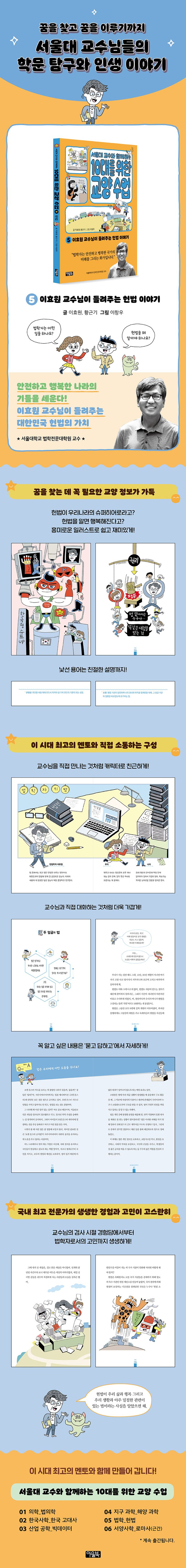 이효원 교수님이 들려주는 〈헌법〉 이야기는 『서울대 교수와 함께하는 10대를 위한 교양 수업』 시리즈의 다섯 번째 권으로, 우리나라 최고법인 ‘헌법’을 연구하며 그 가치를 전하는 법학자 이효원 교수님의 이야기를 담았습니다.
