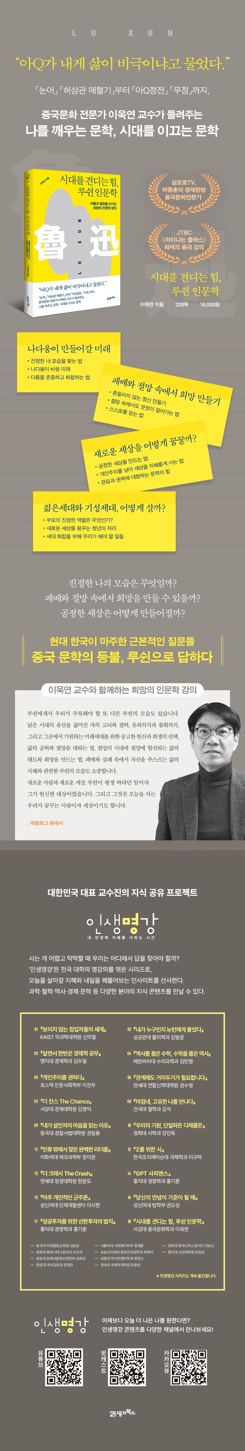 『시대를 견디는 힘, 루쉰 인문학』은 중국 현대문학의 아버지라 불리는 루쉰을 통해 자존감, 세대 갈등, 코로나19 등 현대인이 마주한 문제들에 질문하고 답을 찾아간다. 루쉰의 대표작인 「아Q정전」과 「광인일기」를 비롯하여 이광수의 「무정」, 위화의 『허삼관 매혈기』 등 중국 및 한국 근현대 문학 작품을 두루 경유하여, 현재 한국의 시대적 문제들을 꼬집는 한편 루쉰의 통찰로 대답을 더한다. 중국문화 전문가이자 루쉰의 책을 다수 번역해온 서강대학교 중국문화학과 이욱연 교수가 가이드로 나섰다. 저자는 ‘나다움이 무엇인지’, ‘부모 세대와의 대화는 어떻게 해야 하는지’, ‘청년 세대의 현재는 어떠한지’와 같은 익숙하면서도 삶에 필수적인 질문에 루쉰을 읽으며 저마다의 해답을 찾아보자고 권한다. 낡은 시대의 유산을 짊어지고 더 나은 내일을 꿈꾸었던 루쉰의 고뇌가, 출구 없는 세상을 사는 이들에게 힘이 될 수 있다고 그는 믿는다.