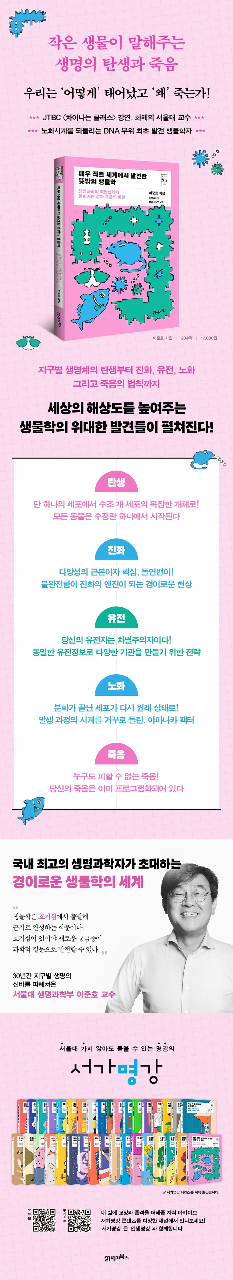 JTBC〈차이나는 클래스〉에서 ‘세상에서 제일 예쁜 벌레 이야기’로 유전학의 오늘날과 미래를 제시해 화제가 되었던 서울대 생명과학부 이준호 교수가 쓴 첫 번째 단독 저서 『매우 작은 세계에서 발견한 뜻밖의 생물학』이 출간되었다. 이 책은 지구 생명체의 기원에서부터 진화, 유전, 노화 그리고 마침내 죽음에 이르는 생명현상의 법칙을 생물학과 친숙하지 않은 사람이라도 쉽게 이해할 수 있도록 흥미로운 연구 사례들을 통해 친절히 안내한다.
