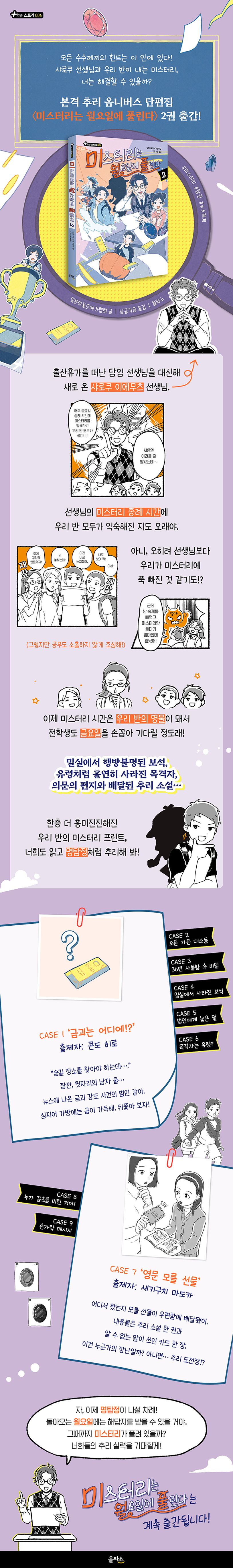 출산휴가 가신 담임 선생님을 대신해 새로 온 셜록 홈스…가 아니고 샤로쿠 선생님의 미스터리 시간에 우리 반 모두가 익숙해진 지 오래다. 아니, 오히려 선생님보다 더 미스터리에 푹 빠진 것 같다. 새로 전학 온 친구마저 우리 반의 명물로 소문난 미스터리 시간에 발표 차례를 손꼽아 기다렸을 정도라고 한다.