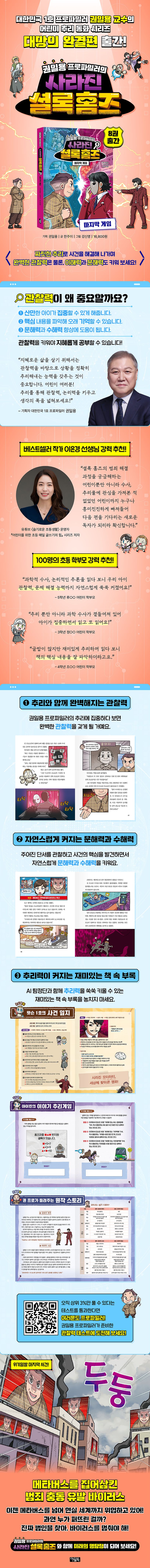 어린이들이 관찰력을 바탕으로 논리력을 키우고, 나아가 지혜로운 삶을 살길 바라는 권일용 프로파일러의 마음에서 시작된 이 시리즈는 흥미진진한 스토리와 탄탄한 콘텐츠로 꾸준히 호평받아 왔다.