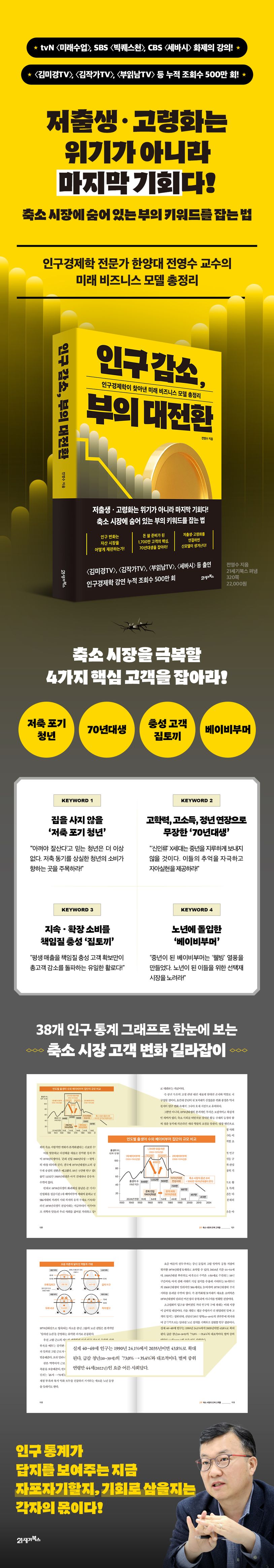 이때 필요한 것이 통계의 힘이다. 해결의 실마리가 보이지 않는 막막한 문제더라도 인구 통계라는 확실한 근거가 바탕이 된다면 돌파구를 찾을 수 있다는 말이다. 이 책의 저자인 인구 통계 전문가이자 인구경제학자인 한양대학교 전영수 교수는 심지어 통계의 눈으로 보면 인구 감소는 악재가 아닌 다시 없을 호재라고 말한다. 뜬구름 잡는 트렌드 예측을 위한 허장성세가 아닌 가장 유사한 모델인 일본과 서구 선진국의 통계를 국내 사례와 비교 · 접목해 얻은 결론이다. 38개 인구 통계 그래프를 통해 근거를 제시하여 꼼꼼한 독자들도 이내 수긍하게 될 것이다.