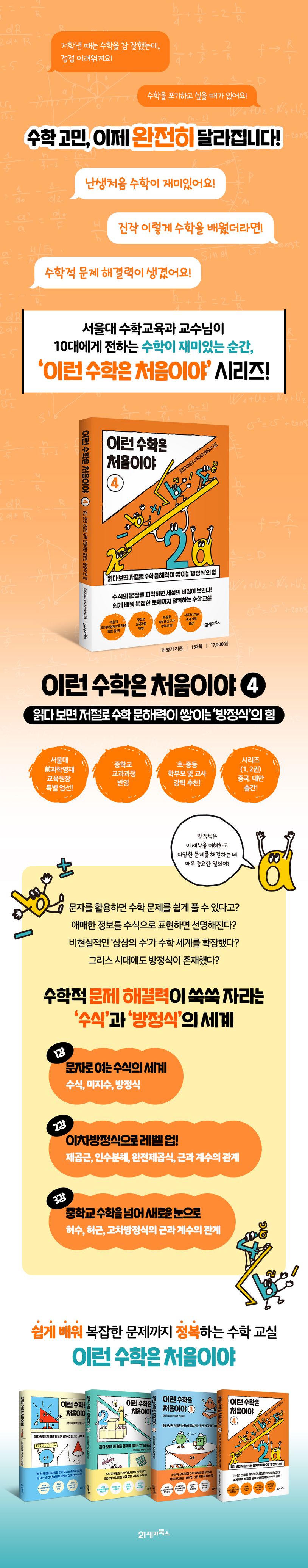 “난생처음 수학이 재미있어요!”, “수학 문해력이 쌓이니 성적이 자연스럽게 올라가요”, “더 이상 수포자가 아니에요!” 수학을 포기하고 싶었던 우리 아이들의 ‘수학 고민’을 한방에 풀어주며 초중등 자녀를 둔 학부모들의 압도적인 지지와 선택을 받았던 화제의 베스트셀러 ‘이런 수학은 처음이야’ 시리즈의 그 네 번째 이야기가 드디어 시작된다. 『이런 수학은 처음이야』 1권 ‘평면도형’, 2권 ‘수’, 3권 ‘입체도형’에 이어 이번에 출간된 4권은 ‘방정식의 세계’로 모험을 떠난다. 서울대 수학교육과 최영기 교수는 이 책에서 수학의 꽃, 방정식을 흥미진진한 이야기로 풀어내면서 우리를 ‘수식’과 ‘방정식’의 무한한 재미에 풍덩 빠뜨린다. 저자는 수식과 방정식의 개념은 학생들에게 수학 교과서를 넘어 우리가 살고 있는 세계의 다양한 문제를 구조적으로 파악하고 이해하게 하며, 문제 해결의 돌파구를 찾게 하는 강력한 무기가 되어준다고 말한다. 저자의 말처럼 이 책이 안내하는 수식에서의 문자 활용에서부터 일차방정식, 이차방정식 그리고 중학교 수학을 뛰어넘는 고차방정식의 여정을 함께하고 나면, 그사이에 쌓인 ‘수학 문해력’을 바탕으로 수식의 본질을 꿰뚫는 ‘수학적 눈’을 갖게 될 것이다.