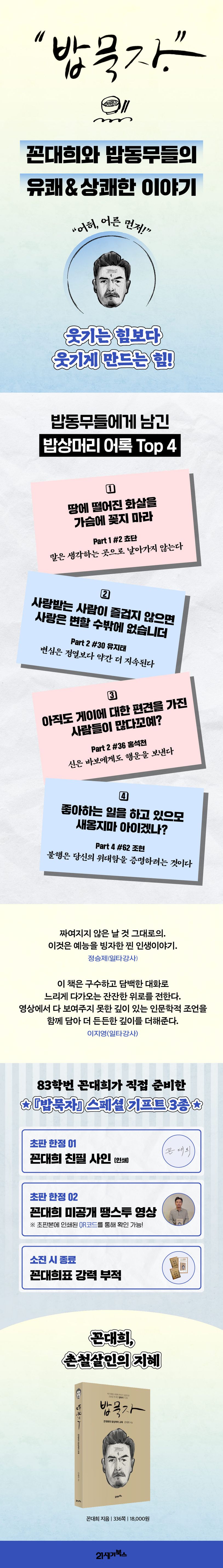 독자들을 독특한 식사의 여정으로 안내하는 ‘꼰대희’의 책 『밥묵자』가 출간됐다. 기존에도 연예인들이 저자인 책들이 많이 나왔으나 이 책은 그런 책들과 궤를 달리한다. 책을 펼쳐 보면 기존 연예인이나 개그맨이 쓴 책과는 사뭇 분위기가 다르다. 책은 인·의·예·지의 네 파트로 나뉘어 있고, 글의 형식은 유튜브에서 친숙해진 〈밥묵자〉의 내용을 기본으로 하되 픽션이 가미되었다. 그리고 본문이 끝날 때마다 〈잔소리 한 숟갈〉이라는 제목이 붙어 있다. 이 부분도 문체는 본문과 마찬가지로 부산식 사투리로 써 내려가는데 그 내용이 범상치 않다.