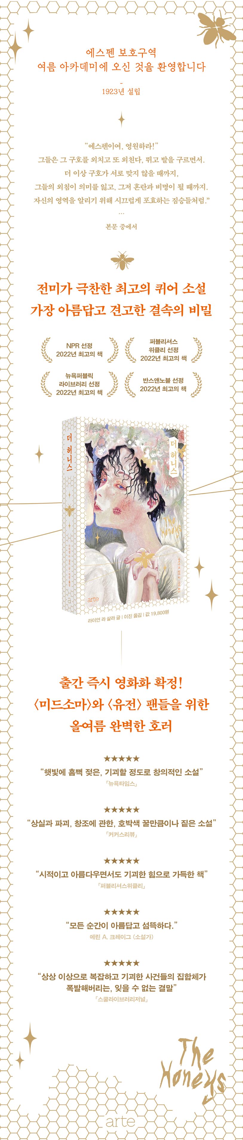 내리쬐는 햇빛을 피할 수도 없는, 진득한 무더위 속에서 일어나는 기이한 사건들과 공포. 그리고 그 한복판에 스스로 걸어 들어간 주인공 마스. 『더 허니스』는 여름마다 생각날 한 권의 소설이 될 것이다.